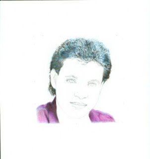 I have a little more darkening of the hair to do and blending of the background, then I will move onto the face. The scan is not picking up the true color of the blue background or the hair exactly. I will see if I can't adjust that, next time I scan.